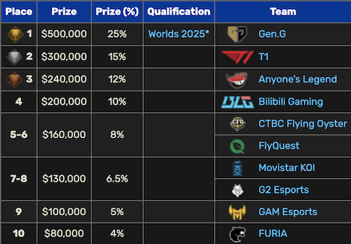 Il 3-2 finale per Gen.G vale 500.000 dollari e la qualificazione diretta ai Worlds. Oltre a questo, le aree LCK (Corea del Sud) e LPL (Cina) hanno guadagnato un quarto slot ai Mondiali. A livello di giocatori, Chovy (Jeong Ji-hoon) è stato nominato MVP della finale, grazie a performance devastanti in momenti chiave della partita.