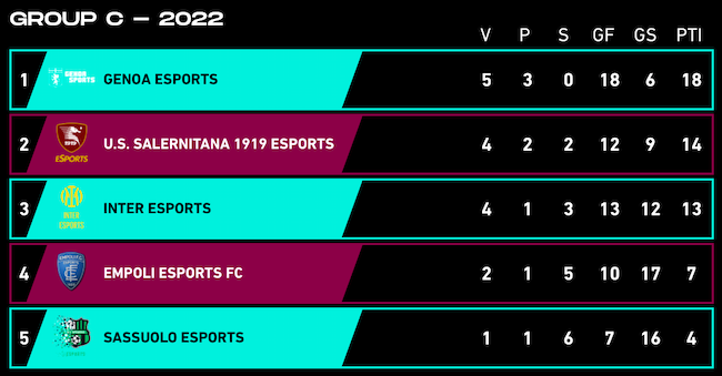 Ricordiamo che tutte le 15 squadre proseguono il torneo, ma le prime due di ogni girone iniziano dal Winner Bracket. A queste si aggiungono le due migliori terze. Finora i team già qualificati sono: Venezia, Bologna, Sampdoria, Torino e Milan, quest’ultima come terza classificata nel Gruppo B ma con più punti della terza classificata del Gruppo A, cioè la Fiorentina.