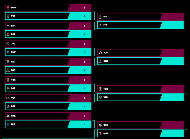 I Playoffs hanno abbinato i 14 esporters in base al posizionamento al termine della Regular Season. Come abbiamo raccontato nei precedenti articoli, l’edizione 2023/2024 ha preso il via con due gruppi da 7 team ciascuno, disputati in modalità round robin singolo. Completate le 6 sfide incrociate, i prime due di ogni gruppo hanno ottenuto la qualificazione diretta alle Final 8 e ieri si sono sfidati solo per poter scegliere il lato del tabellone dal quale iniziare l’ultima fase del torneo. Gli altri 12 – non c’è stata quindi alcuna eliminazione dai gruppi – hanno dato forma al tabellone vero e proprio dei Playoffs.