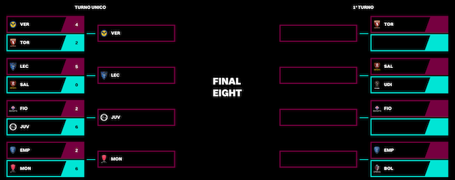 A questo punto il quadro delle prime 4 qualificate alle Final Eight, in programma il 18 e il 19 aprile 2023, è completo: Verona, Lecce, Juventus e Monza. Le altre 4 arrivano oggi, al termine del Loser Bracket dei Playoffs.