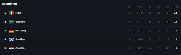 Nell’ultima sfida del girone di andata gli azzurri (sempre Danilo Pinto e Francesco Tagliefierro) si sono ripresi i 3 punti, rifilando un 4-2 al team croato. Al termine delle prime 4 partite la Svezia ha chiuso al comando con 10 punti. Seconda la Germania a 8, terza l’Italia a 6, Scozia a 4 e Croazia ultima con 0 punti.