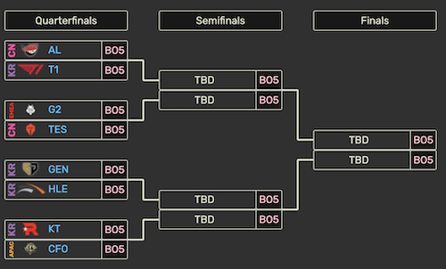 Il Play-Ins iniziale ha messo di fronte i seed #4 di LCK (il competitivo Sudcoreano) e LPL (quello cinese), ovvero T1 e Invictus Gaming. La sfida unica best-of-5 ha visto i sudcoreani, 5 volte campioni del mondo sotto la guida del GOAT di LoL Lee “Faker” Sang-hyeok, prevalere per 3-1.