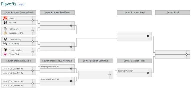 Oltre alle quattro organizzazioni appaiate al primo posto, ai Playoffs accedono anche il Team BDS (5-4), GIANTX (4-5), Mad Lions KOI (4-5) e SK Gaming (3-6), quest’ultima solo dopo lo spareggio vittorioso sui Rogue ai quali non è bastato il ritorno in squadra del toplaner svedese Finn “Finn” Wiestål.