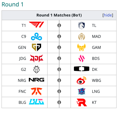 Con le vittoria di BDS e GAM termina la fase Play-In del campionato mondiale di League of Legends. Il 19 ottobre inizia lo Swiss Stage del Main Event: un torneo con 16 squadre riunite in un unico girone dove si affrontano in 5 partite. Il primo abbinamento è tra formazione che necessariamente provengono da aree geografiche diverse. I successivi sono in base ai risultati (sistema svizzero): vincenti con vincenti, perdenti con perdenti. Le prime tre partite sono Bo1, le ultime due Bo3. Chi vince tre partite accede al Knockcout Stage, chi ne perde tre è eliminato.