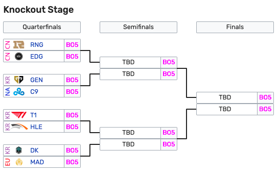 Tirando le somme, al Knockout Stage ci saranno 4 team sudcoreani (3 primi posti nei gironi e un secondo), due cinesi (un 1° e un 2°), uno europeo e uno nordamericano. Il tabellone dei quarti di finale è questo: