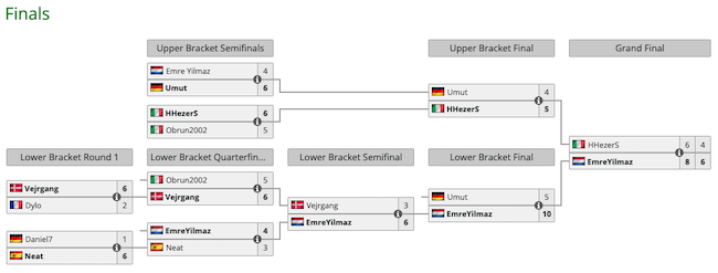 A questo punto Umut è sceso nel LB dove ha trovato ad attenderlo EmreYilmaz, per la qualificazione alla finalissima del torneo. L’olandese si è preso una bella rivincita condita da una vera e propria goleada: la prima gara si è conclusa 3-3, ma nella seconda Yilmaz ha dilagato chiudendola con un pesantissimo 2-7!