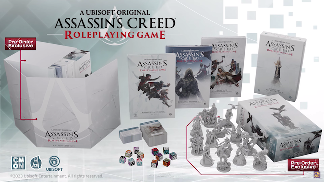Assassin’s Creed: Roleplaying Game prevede la pubblicazione di almeno tre manuali. Naturalmente c’è il regolamento generale dedicato ai giocatori, cioè l’Animus Handbook: Core Rules. Il manuale per il master, qui chiamato Reader, è il Forging History: Campaign Book. Presente anche un compendio sui più amati protagonisti della serie, intitolato Legacy of the Brotherhood: Master Assassins. CMON realizzerà inoltre, quantomeno per i preordini, altri strumenti come mazzi di carte dedicate, miniature e dadi personalizzati.