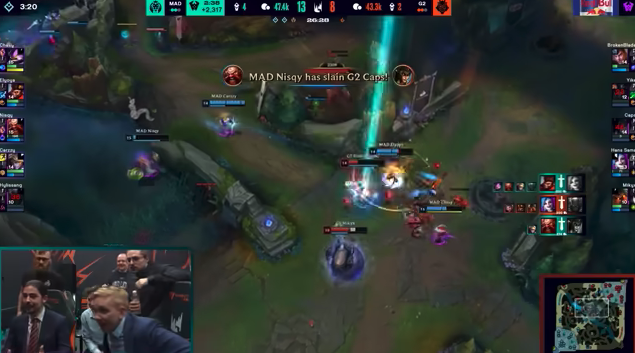 Ma questa loro vittoria ha i caratteri della sorpresa perché finora il club spagnolo avevano faticato molto nel LEC Spring Split. Dopo essersi qualificati al secondo turno per il proverbiale rotto della cuffia (8° posto nel girone e vittoria sul team Heretics nello spareggio), i Mad Lions hanno iniziato a carburare, ma non senza qualche brivido.