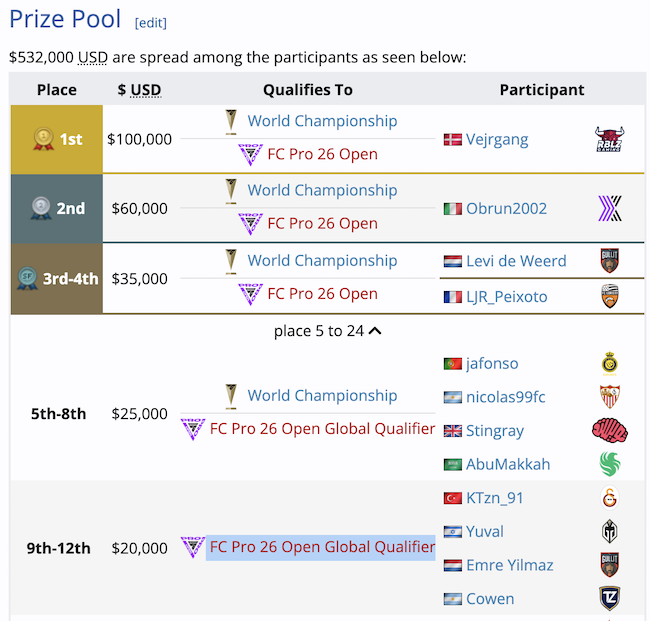 Mondiale raggiunto anche per altri 6 giocatori, cioè tutti quelli che hanno raggiunto i quarti di finale. I giocatori usciti nel preturno hanno invece ottenuto, oltre ai soldi in premio, l’iscrizione diretta all’FC Pro 26 Open Global Qualifier del prossimo anno. Ecco il quadro delle posizioni premiate: