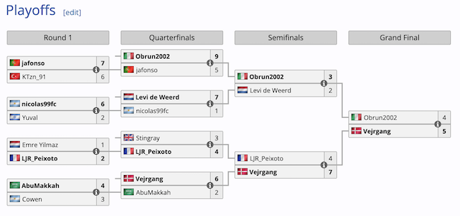 Semifinali. Tutto facile per lo scatenato e stravagante Stingray: 7-4 a LJR Peixoto. Più sofferta è stata invece la vittoria di Obrun2002 su Levi de Weerd. L’olandese ha segnato la prima rete, ma Tagliefierro lo ha raggiunto sul finire del primo tempo. L’italiano ha raddoppiato all’inizio del secondo. De Weerd è tornato in partita all’80°, su un calcio di punizione piuttosto elaborato. All’85° arriva però lo svarione difensivo su un bel passaggio filtrante, Obrun2002 ne approfitta e insacca con Henry: 3-2 e la finale è servita!