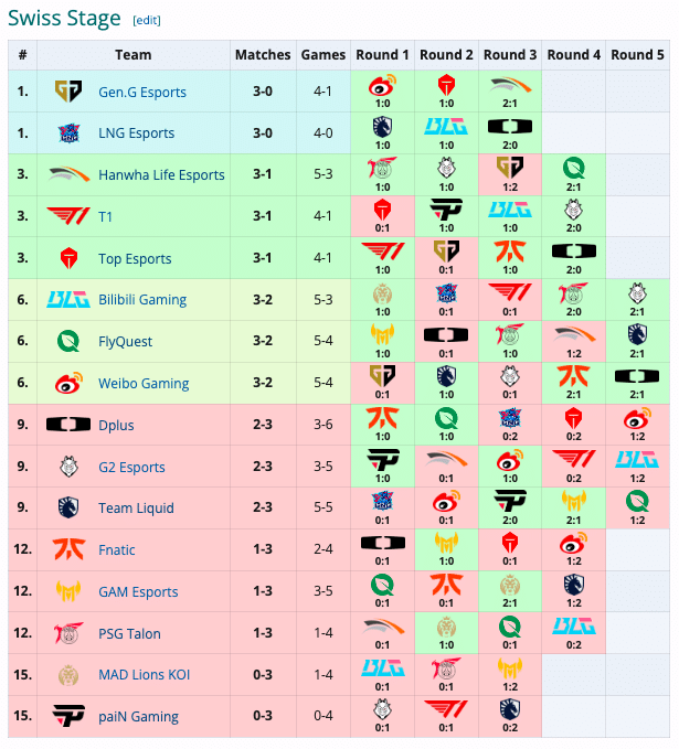 Il resto è completato da tre organizzazioni cinesi, oltre a LNG Esports: Top Esports (3-1), Bilibili Gaming e Weibo Gaming (3-2). Nell’ultimo round dello Swiss Stage, i Bilibili Gaming hanno eliminato con il punteggio di 2-1 i dominatori della scena EMEA 2024, G2 Esports. Weibo ha invece mandato a casa – altro 2-1 – Dplus, vincitori dei Worlds nel 2020 e runner-up l’anno successivo.