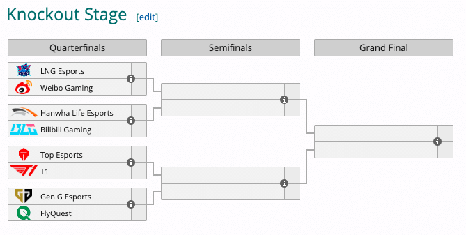 E’ difficile fare previsioni, anche se nella parte bassa del tabellone è ipotizzabile una semifinale tutta sudcoreana tra T1 e Gen.G. La parte alta, invece, vede LNG favorita nel derby cinese, mentre più equilibrata è la sfida Corea-Cina, cioà Hanwha vs Bilibili.