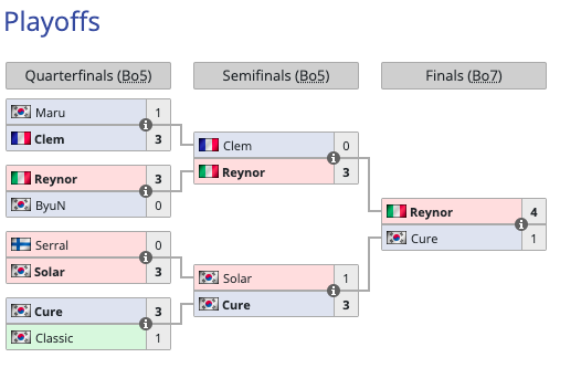 Nella fase ad eliminazione diretta, l’italiano ha concesso solo un game con i suoi affezionati Zerg. Nei quarti si è sbarazzato di Byun (Terran) per 3-0. Stessa sorte e stesso risultato subito da Clem (Terran) in semifinale.