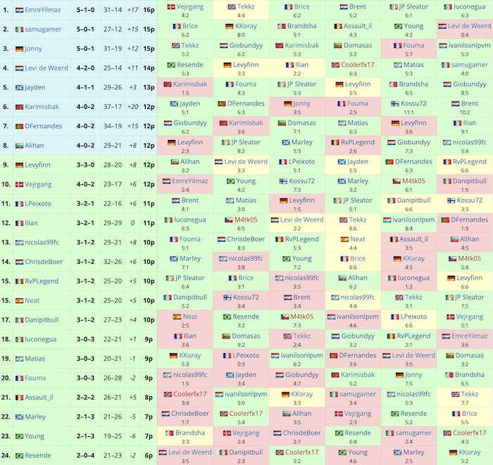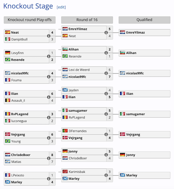 Insieme a Samugamer_07, si sono qualificati anche tutti gli altri italiani. Karimisback ha chiuso 6° con 4 vittorie e due sconfitte, perdendo solo dal tedesco Jonny, primo lo scorso anno nella eChampions League, e da Julien “Fouma” Perbal, campione di Francia con il Lorient. Più sotto troviamo Danipitbull (17°), autore di uno score non eccezionale (3-1-2, ma vincitore su Vejrgang per 5-1) e Luconegua che ha totalizzato tre vittorie e tre sconfitte.
