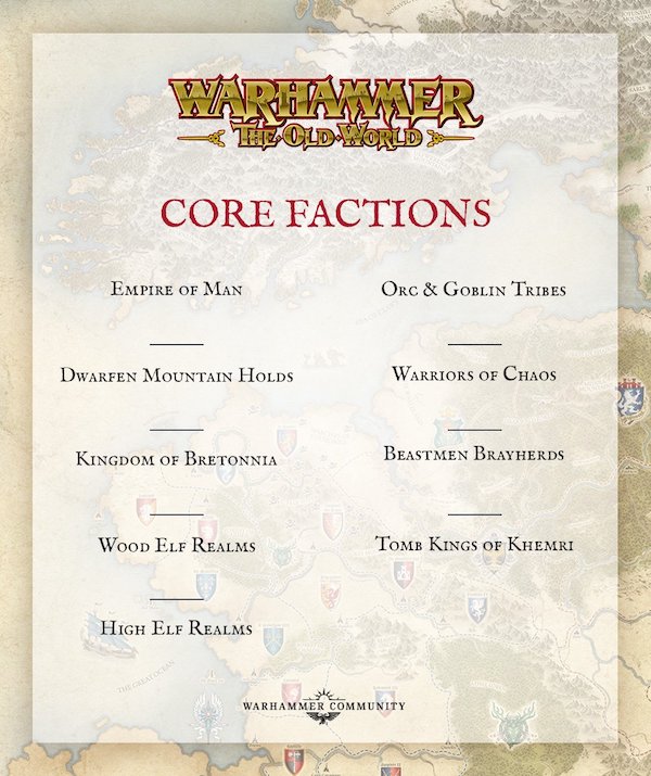 Tuttavia, rispetto a Warhammer Fantasy ne mancano 7, alcuni dei quali erano molto gettonati dai giocatori: Elfi Oscuri, Skaven, Demoni, Uomini Lucertola, Conti Vampiro, Regni degli Ogri e Nani del Caos. GW si è espressa anche su questo punto confermando che ci sarà un set di regole per tali eserciti, nonostante non facciano parte dell’ambientazione. Il tutto sarà limitato a pdf gratuiti e senza altri materiali specifici: “These legacy faction army lists will be made available for free as pdfs as a service to fans who have these classic armies on their shelf“.