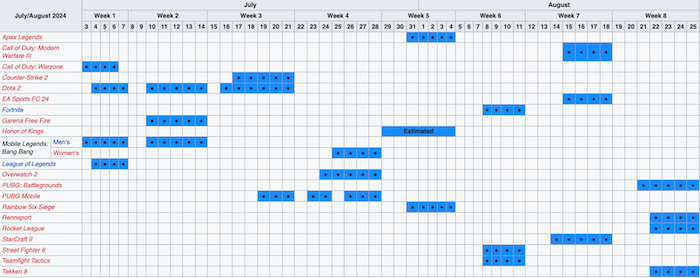 I primi tornei sono quelli di Call of Duty: Warzone (03-06/07) e Mobile Legends (torneo maschile dal 3 al 14 luglio). Il giorno successivo fanno il loro ingresso i due MOBA più giocati. Il torneo di LoL va dal 4 al 7 luglio, mentre quello di Dota 2 è molto più lungo e si protrae – con alcune pause – fino al 21 luglio.