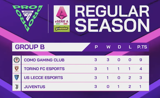 Se il Gruppo A è stato all’insegna dei colpi di scena e del bilanciamento tra gli esporter, il B ha regalato lo show di Anders “Vejrgang” Vejrgang. Ceduto quest’anno in prestito al Como 1907 dal team saudita Falcons, il pro danese non ha fatto sconti agli avversari. Alla fine ha totalizzato 9 punti, tre vittorie su altrettante partite, segnando 26 reti e subendone 15. Va però detto che solo il Lecce di Raffaele “Er_Caccia98” Cacciapuoti è stato travolto (13-5 il punteggio); le partite contro Torino e Juventus sono state molto più tirate.