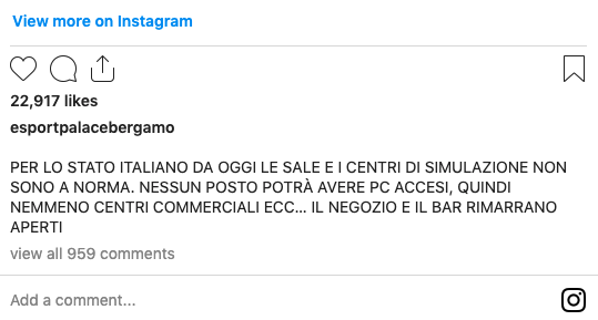 Tra questi c’è anche il ben noto eSportPalace di Bergamo, sede dell’organizzazione esportiva Samsung Galaxy. I gestori dell’importante struttura hanno subito replicato con un post su Instagram: