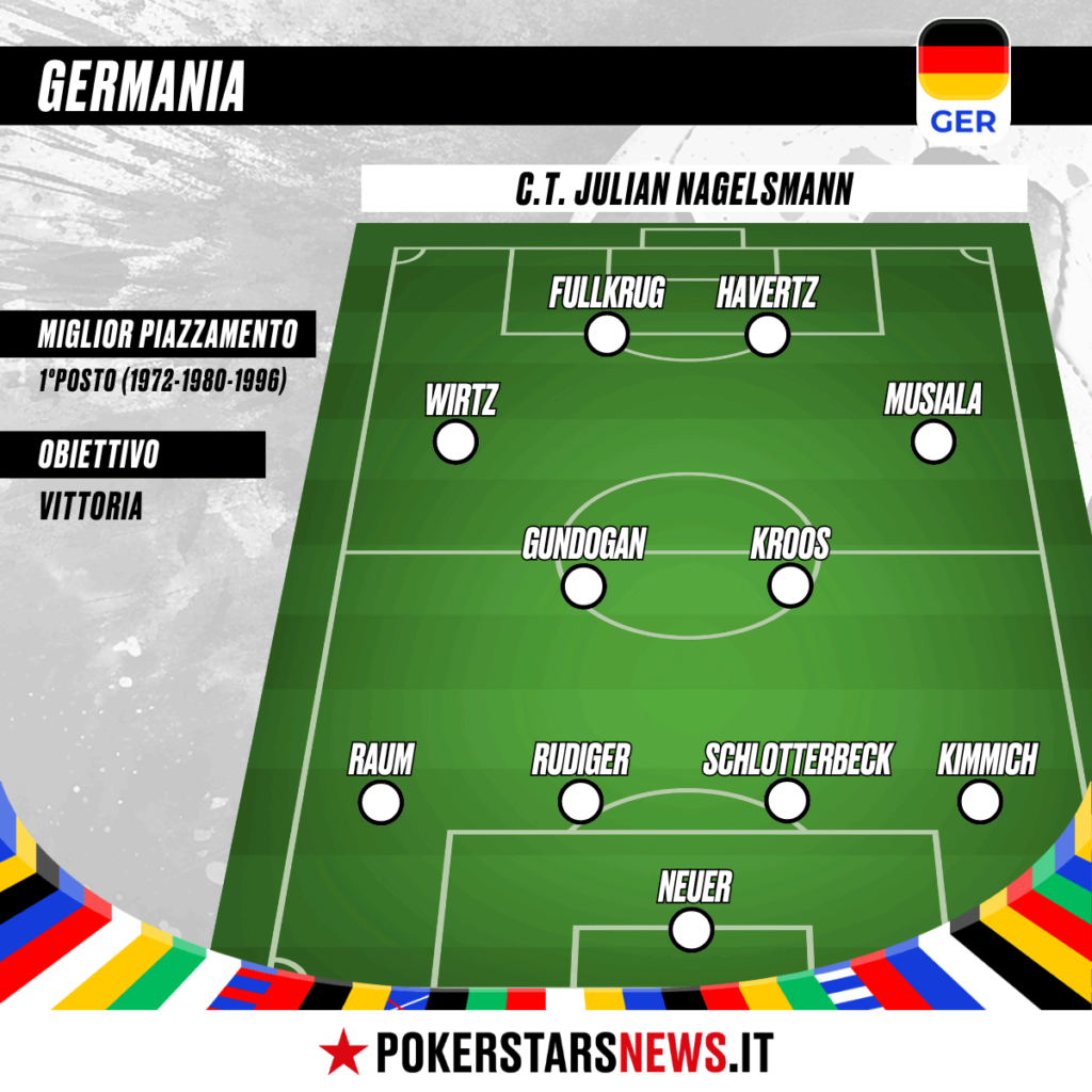 - Germania (4-2-2-2): Neuer; Kimmich, Schlotterbeck, Rudiger, Raum; Gundogan, Kroos; Musiala, Wirtz; Fullkrug, Havertz. CT: Julian Nagelsmann.