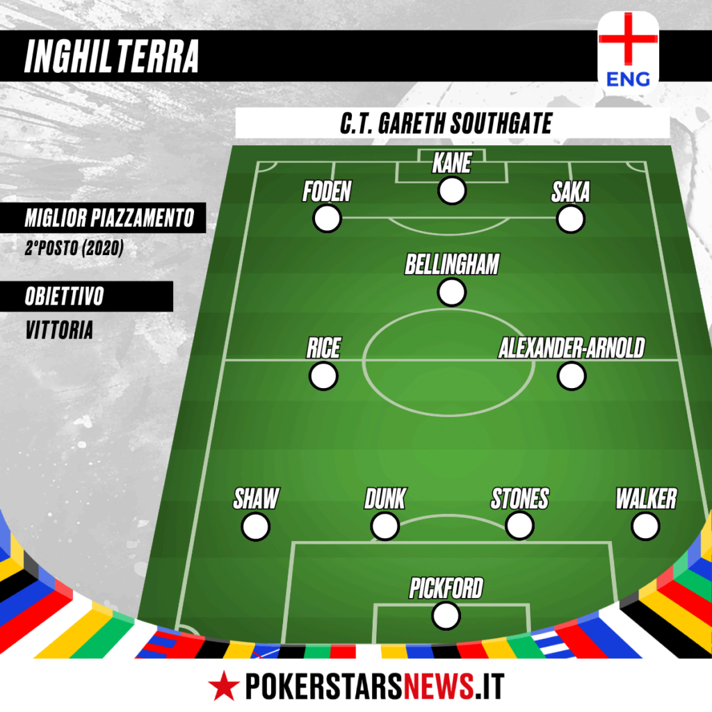 Inghilterra (4-3-3): Pickford; Walker, Stones, Dunk, Shaw; Alexander-Arnold, Rice, Bellingham; Saka, Kane, Foden.
