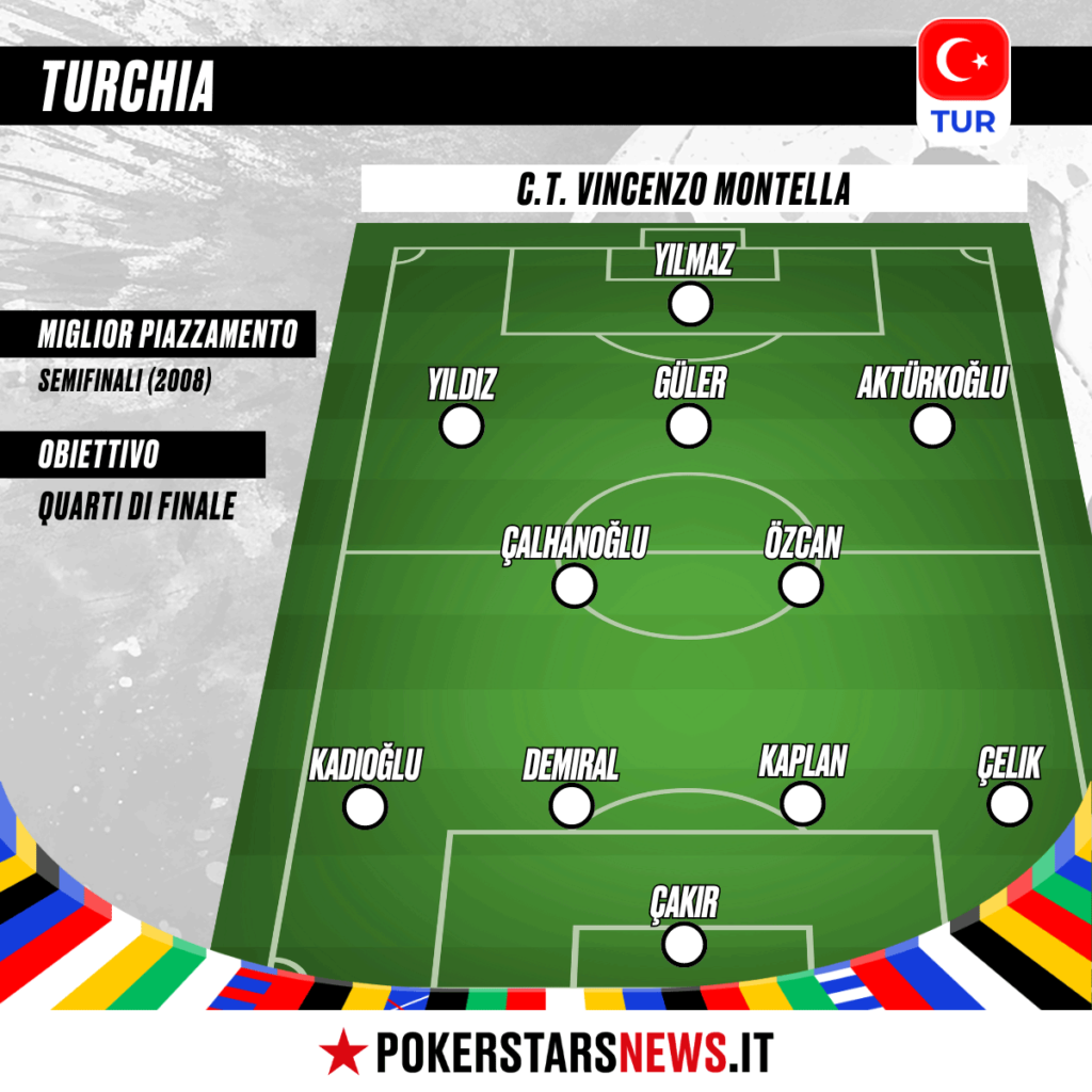 Dopo l’ottimo cammino nelle qualificazioni ad Euro2024, gli Ottomani puntano ad un risultato importante. Difficilmente potranno alzare il trofeo, ma sé approdare agli ottavi di finale appare come il risultato minimo, staccare il pass per i quarti di finale è il vero obiettivo della squadra di Vincenzo Montella. Ricordiamo che il miglior risultato in assoluto della Turchia nel campionato europeo risale alla semifinale del 2008. Insomma, una mina vagante che supportata dal tifo amico può davvero andare lontano in terra tedesca.