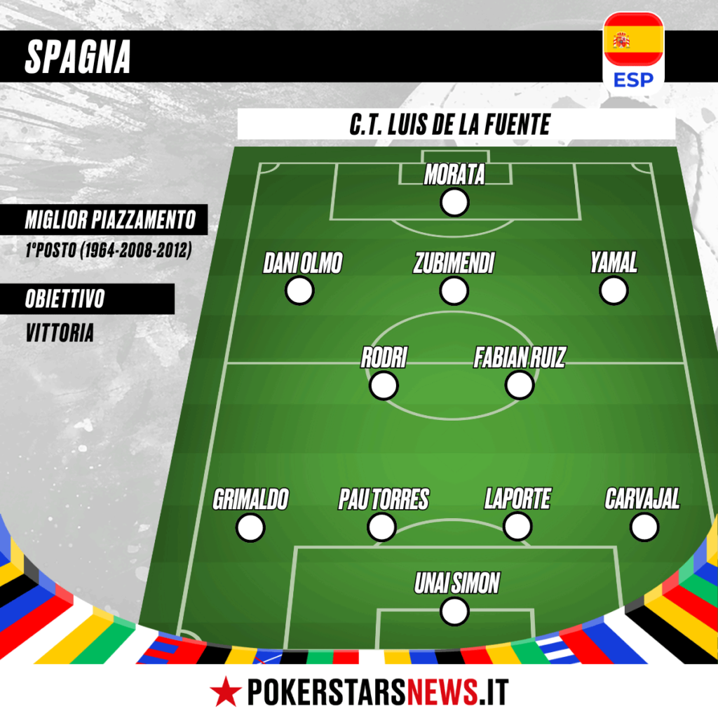 Spagna 4-2-3-1: Simon; Carvajal, Torres, Laporte, Grimaldo; Rodri, Fabian Ruiz; Olmo, Zubimendi, Yamal; Morata Allenatore Luis De La Fuente