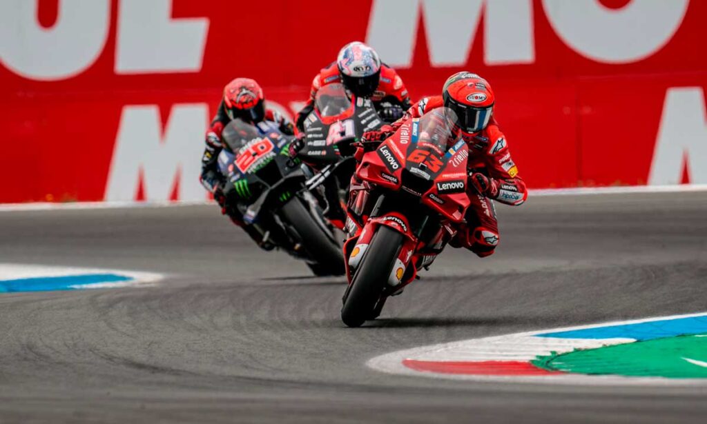 Il Gran Premio d’Olanda della MotoGP, che pareva poter cominciare sotto l’egemonia francese di Fabio Quartararo – fino ad ieri impeccabile con la sua Yamaha – si risolve invece con un risultato che fa felici tutti i tifosi azzurri: vince infatti “Pecco” Bagnaia, seguito da Marco Bezzecchi che completa la doppietta Ducati. Terzo gradino del podio per Maverick Vinales, che però in qualche modo porta un po’ di tricolore sul podio grazie alla sua Aprilia.