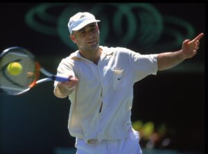 Alto un metro e ottanta per 74 chili di peso, Andre Agassi negli anni dei suoi esordi, salì alla ribalta non solo per il talento cristallino (nel 1988 vinse premi per oltre un milione di dollari partecipando ad una quarantina di tornei) ma per l’estro e la sfacciataggine mostrata nei confronti di un mondo, quello del tennis, dove l’etichetta è una dote essenziale. Era solito presentarsi in campo in tenute sgargianti come le acconciature dei suoi folti capelli biondi. Si racconta che anche per questo non gli fu permesso di partecipare a Wimbledon. Il 1988 è l’anno in cui Agassi è uno dei primi dieci al mondo, posizione che conferma di meritare ad ogni match disputato. Indimenticabile l’impresa che seppe “firmare” nel 1992 sui campi in erba di Wimbledon: nei quarti di finale superò Boris Becker (che per tre anni aveva vinto il torneo londinese), in semifinale ebbe la meglio su John McEnroe ed in finale completò l’opera battendo Goran Ivanišević. Sulla scia dell’entusiasmo, poche settimane dopo chiude vince ad Atlanta e al Master Series di Toronto. La definitiva consacrazione di Andre Agassi arriva nel 1995, indiscutibilmente il suo anno migliore. Si presenta in campo con la testa rasata ma riesce ad esprimere concentrazione, mentalità vincente sfoderando incredibili colpi. Inizia la sua ascesa aggiudicandosi l’Australian Open, vince i Master Series di Cincinnati, Key Biscayne e Toronto, vince la Coppa Davis con gli States recitando un ruolo fondamentale. E’ in finale anche agli Us Open ma è sconfitto da Pete Sampras. Chiuderà l’anno con 72 vittorie e 10 sconfitte. La data da immortalare è però quella del 10 aprile quando sale al primo posto del ranking mondiale della ATP.