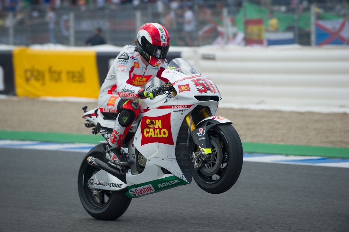 E si arriva così a quel giorno in Malesia, dove il terzo posto conseguito su quel circuito di Sepang coronerà la vittoria del Mondiale, resa ancora più significativa dalla sesta affermazione in sedici gare, arrivata nell’ultimo circuito stagionale, quello della Comunità Valenciana. Tutta Italia ha in simpatia Simoncelli, il suo stile di guida e quel suo carattere esuberante tipico del romagnolo, unito alla sua immagine da ragazzo gioviale, con i capelli mossi a creare un look subito riconoscibile, portano molti tifosi ad affezionarsi a quel pilota che era, a tutti gli effetti, un predestinato. Mantenne il livello molto alto anche nel 2009, quando da campione in carica decise di correre un altro anno in 250. Questa volta le vittorie saranno cinque, ma rimane l’amaro in bocca per la gara conclusiva, in cui, ancora in gara per il titolo, scivola sul terreno mentre era in testa, consegnando de facto il Mondiale ad Aoyama e anche la seconda piazza a Barberà. Nel 2010 finalmente la MotoGP, in sella alla Honda: dopo un primo anno di ambientamento con un ottavo posto in classifica, l’anno successivo inizia a ottenere podi, dal terzo posto di Brno fino al secondo in Australia, prima di quel maledetto giorno a Sepang. Già, proprio Sepang, da dove è cominciata la nostra storia. Quello che accadde quel giorno in Malesia è tristemente noto a tutti, Marco ci ha lasciato a 24 anni dopo un tragico incidente, di quelli che negli sport motoristici purtroppo, sempre più raramente, capitano. Per capire il suo impatto nella memoria collettiva va ricordato l’oceano di gente presente alle esequie pubbliche, oltre 25000 persone, gli innumerevoli tributi ricevuti dal mondo sportivo, motoristico e non, e per finire l’intitolazione, a sua memoria, del circuito di Misano Adriatico, situato nella provincia di Rimini, quella nella quale Marco viveva. Ma noi, così come crediamo chiunque, vogliamo ricordarlo così: con quella maglia bianca celebrativa del suo primo Mondiale, mentre volava in sella alla sua moto, ebbro di gioia, su quel benedetto e poi maledetto, circuito di Sepang.