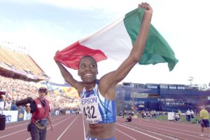 Si trasferì quindi nel nostro Paese, dove presto conobbe e si innamorò di Gianni Iapichino, fiorentino, anche lui atleta specializzato nel salto con l’asta, con cui si sposò nel ’94, ottenendo la cittadinanza italiana. Iniziò subito a rappresentare il tricolore e lo fece con grande successo, dato che già ai campionati mondiali di atletica di Goteborg 1995 vinse la medaglia d’oro, saltando ben 6,98 metri. C’erano grandi aspettative per le Olimpiadi, che furono ben ripagate: ad Atlanta ’96 vinse l’argento con un salto di 7,02 metri, dietro solo alla nigeriana Ajunwa. Grazie a questo successo la sua popolarità crebbe, e le sue prestazioni rimasero alte, dato che nei successivi mondiali arrivarono un bronzo, un argento e un altro oro, oltre a un salto di 7,11 metri che è tuttora il record italiano nel salto lin lungo. Un altro grande successo arrivò ai Giochi Olimpici di Sydney 2000, dove vinse la sua seconda medaglia olimpica, di nuovo un argento, con un salto di 6,92 metri superato solo dalla tedesca Heike Drechsler. Negli anni 2000 abbandonò le competizioni, ed ebbe due figlie: Larissa, nata nel 2002, e Anastasia, nata nel 2009. Nonostante la separazione intervenuta con il marito negli anni successivi, Fiona May rimarrà in Italia, sempre nella zona di Firenza, non mancando mai di ringraziare l’Italia per averla accolta e accettata fin dal primo giorno, e sottolineando come non abbia mai subito nessun episodio di discriminazione. La primogenita, Larissa Iapichino, oggi maggiorenne, sta portando avanti con grande forza quella che gli americani chiamano la “legacy” della madre. Nel 2019, ha fatto registrare un salto di 6,64 metri, tra le migliori prestazioni di sempre. Pochi mesi fa, due giorni prima del suo diciottesimo compleanno, ha saltato ben 6,80 metri, classificandosi solo dietro alla madre per quanto riguarda il record italiano di salto under 20. Larissa ora sogna le Olimpiadi di Tokyo, che dovrebbero tenersi nel 2021 dopo il rinvio a causa della pandemia. Speriamo che la ragazza riesca a farci rivivere le emozioni che ci ha fatto provare Fiona May.
