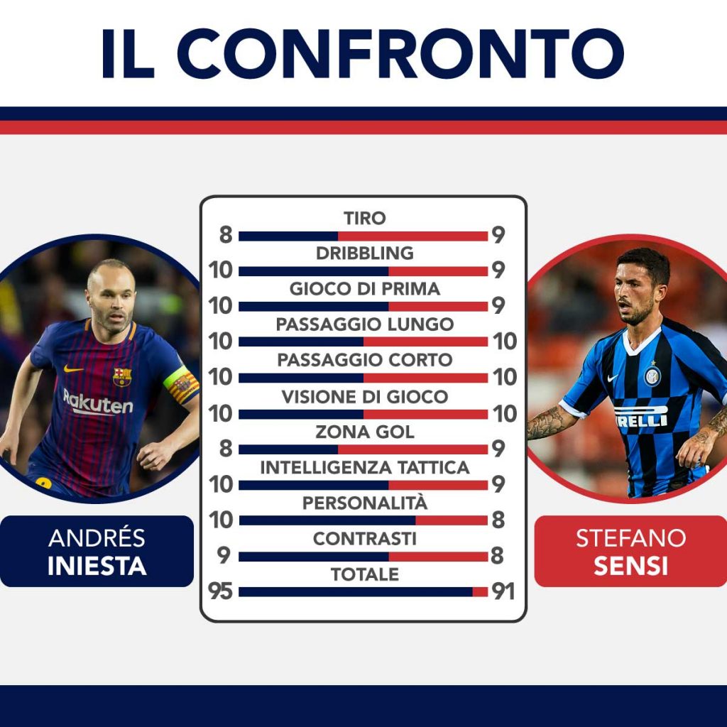 Sicuramente la statura ed il fisico minuto sono gli elementi che portano all’accostamento tra i due giocatori, di primo acchito. Ma andando ad analizzare il gioco di Sensi, in particolare da quando è arrivato all’Inter e può fare affidamento su due centrocampisti bravi a coprire gli spazi arretrati come Brozovic e Barella, si notano alcune affinità con quello di Iniesta. Sicuramente non ha quelle doti di prestigiatore che il campione spagnolo ha fatto vedere sui campi di tutta Europa, ma centrocampisti che uniscono alla visione di gioco una tale rapidità di esecuzione ed un tale controllo di palla sullo stretto non sono così comuni nel campionato italiano.