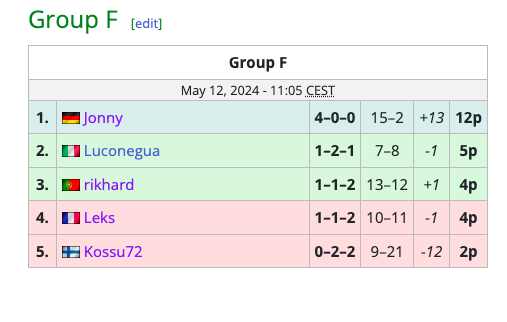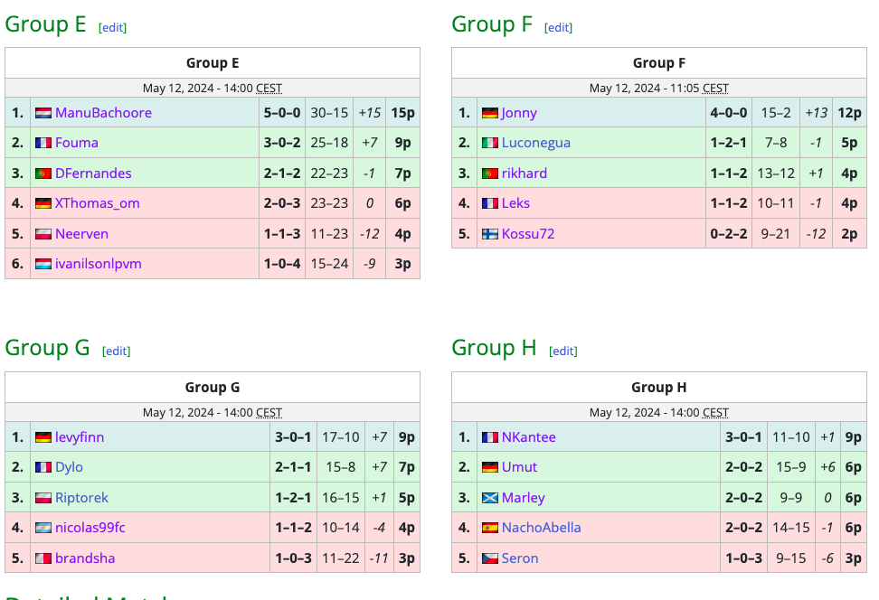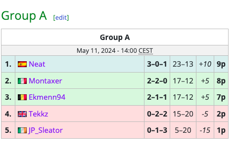 Andrea Montanini stranamente non ha invece conquistato il primo posto nel Gruppo A, preceduto di un solo punto da Ander “Neat” Tobal (semifinalista de LaLiga) il quale invece ha perso una partita ma ha vinto tutte le altre tre. 9 punti per lo spagnolo e 8 per l’ex player della Salernitana (ora in forza al club francese Lorient), nonostante quest’ultimo avesse vinto lo scontro diretta in maniera molto netta: 5-2. Montaxer ha pagato soprattutto il pari rimediato nel primo match (2-2) con il belga Ekmenn94.
