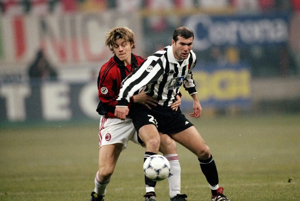 Quella sera Zaccheroni schierava il solito 3-4-3 con Ayala al posto di Costacurta in difesa, due esterni alti e un tridente con Leonardo, spesso in gol dalla panchina, al posto dell’indisponibile Boban. Nella Juve Tudor al posto di Iuliano, ovviamente Nick Amoruso supplisce alla mancanza di Del Piero. La partita è molto ruvida fin dall’inizio, l’arbitro estrarrà dieci cartellini gialli, cinque per parte. Il Milan parte a mille, i bianconeri vanno in difficoltà: spesso colti di sorpresa, gli ospiti devono ricorrere alle maniere forti, con Davids che mette giù impunemente Leonardo, mentre Tudor falcia Weah in area, per un rigore ineccepibile. Peruzzi intuisce, ma Albertini trasforma l’1-0. I padroni di casa spingono molto ma non raddoppiano, la Juve, dopo un primo tempo incolore, vive un’ottima ripresa, anche grazie all’ingresso in campo di Antonio Conte e Paulo Fonseca. All’inizio della ripresa Tudor segna di testa su punizione, ma Bettin annulla in maniera incomprensibile. Si finisce in dieci contro dieci, dato che Montero viene espulso per un fallo di mano di troppo, e Weah, incontenibile all’inizio, cacciato per doppio giallo appena quattro minuti dopo. Nel finale il Milan non tiene più: palla dentro per Fonseca, dribbling e palla in rete per l’attuale allenatore della Roma, che fissa il punteggio sull’1-1 al minuto 85. Finisce senza vincitori né vinti una partita molto maschia, come si direbbe un tempo, che consegna un punto che poco serve alle due squadre. Tuttavia, l’annata finirà in maniera trionfale per il Milan, capace di rimontare prima la Fiorentina e poi la Lazio di Eriksson, superata dopo una striscia di sei vittorie di fila, con il titolo conquistato nell’ultima giornata a Perugia, uno dei più insperati della storia rossonera. Per la Juve sarà invece una stagione terribile, conclusa al settimo posto e fuori dalle coppe europee. Lippi, promesso sposo dell’Inter, se ne andrà dopo un 2-4 subito in casa dal Parma, lasciando il suo posto a Carlo Ancelotti, il quale riuscirà a raddrizzare la situazione e a rimanere anche nei successivi due anni alla Vecchia Signora, senza però mai riuscire a centrare il grande obiettivo dello Scudetto.