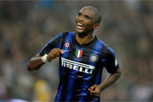 Lascia la Spagna dopo 200 gol complessivi, passando all’Inter nell’estate del 2009, nell’ambito di uno scambio con Ibrahimovic. Uno dei più grandi colpi della storia nerazzurra, visto il suo enorme contributo nei due anni a Milano. Nel 2010 è subito Triplete, di nuovo: Eto’o segna meno del solito, ma grazie ai suggerimenti di Mourinho si sacrifica con umiltà per il bene della squadra, difendendo anche, quando serve. Di gol pesanti ne mette comunque a segno, basti pensare a quello contro la Juve, al ritorno con il Chelsea, o anche all’assist nella finale contro il Bayern, partita in cui l’Inter rivince la Champions dopo 45 anni, la terza sollevata da Samuel Eto’o. La stagione successiva è invece il padrone assoluto dell’attacco nerazzurro, complice anche gli infortuni di Milito, segna 37 gol in un anno, il suo massimo in carriera, sotto solo a Meazza e Angelillo nella ultracentenaria storia dell’Inter. Decide la Supercoppa Italiana, Il Mondiale per Club, la Coppa Italia, segna in qualsiasi modo, gol di rapina e gol stupendi, un dominio che giusto il miglior Ronaldo aveva fatto vedere a Milano. Eppure la sua storia interista termina poco dopo. L’Anzhi Makhachkala, una sconosciuta squadra del Daghestan, gli offre 20 milioni di euro all’anno, e il trasferimento è definito. In molti hanno accusato Eto’o di avere a cuore solo i soldi, il giocatore ha risposto che voleva dimostrare ancora una volta di essere il numero uno, portando in alto una squadra senza storia. Sicuramente può aver influito anche l’aria che tirava all’Inter, che inizierà proprio da lì la sua parabola discendente, fatto sta che Eto’o rimase in Russia due anni, portando la squadra al terzo posto, prima di andarsene per il disimpegno finanziario del magnate Kerimov. Tornerà al Chelsea, ritrovando Mourinho, ma non sarà una grande stagione. Anche le successive esperienze con Everton e Sampdoria sono decisamente deludenti. Forse, a 35 anni il Leone non ha più fame. Si è ritirato nel settembre del 2019 dopo aver regalato gli ultimi sprazzi del suo calcio tra Turchia e Qatar. Recentemente è stato vittima di un brutto incidente, dal quale tuttavia ne è uscito bene. Il quattro volte calciatore africano dell’anno ha lasciato un segno indelebile in questo sport, e vederlo giocare è stata un’esperienza indimenticabile per tutti gli amanti del calcio.