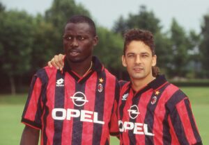 Nella più prestigiosa delle coppe europee Weah si scatenò, segnando 6 gol nella fase a gironi, ove i francesi vinsero tutte le partite, e uno, importantissimo, al Camp Nou, permettendo alla squadra di eliminare il Barcellona e arrivare in semifinale, dove affrontarono il Milan. Nel doppio confronto i rossoneri prevalsero 1-0 al Parco dei Principi e 2-0 a San Siro, rimanendo colpiti dalle qualità del liberiano. Il Milan non vincerà quella Champions, sconfitto in finale dall’Ajax, ma Weah, capocannoniere della manifestazione, troverà la sua nuova casa proprio a Milano. Viene acquistato per 11 miliardi di Lire dalla squadra di Capello, nello stesso anno in cui approda in rossonero anche un certo Roberto Baggio. Weah dimostrerà presto di non avere timori reverenziali nei confronti del calcio italiano: dopo 7 minuti dal suo debutto segna di testa nel match contro il Padova, per macinare in seguito diverse reti contro squadre importanti, come Juventus, Fiorentina, Lazio e Roma. In particolare contro le squadre della Capitale, realizza due reti favolose, che consentono ai rossoneri di sbancare l’Olimpico: in entrambi i casi, un suo dribbling ubriacante lascia sul posto i difensori avversari, per poi battere l’inerme portiere in uscita con una frustata di destro. Il 26 dicembre 1995 il verdetto parlò chiaro: con 170 voti, Weah divenne il primo giocatore non europeo a vincere il Pallone d’oro, anticipando giocatori come Klinsmann, Del Piero e Litmanen. Nello stesso anno vinse anche il FIFA World Player, e potette sollevare la sua sfera dorata tra il giubilo del Meazza nella sfida contro la Sampdoria del 7 gennaio 1996. Quel Milan, a fine anno, diventò anche Campione d’Italia con 73 punti, +8 sulla Juventus campione uscente, seconda ma vincitrice della Champions League. Weah segnerà 15 gol complessivamente, legando il suo nome alla squadra milanese fino al 2000, vincendo anche un altro Scudetto nel 1998-1999. George Weah, da sempre attento ai temi cari il futuro del suo Paese, nel 2017 ha vinto le elezioni presidenziali, ed è tutt’ora il Presidente della Liberia, facendo di lui l’unico Pallone d’oro ad essere eletto capo di una nazione.