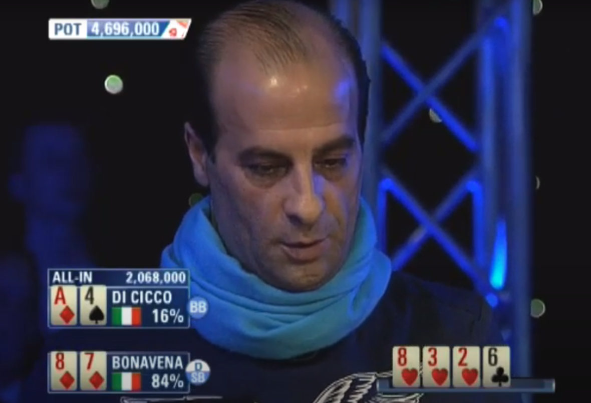 Franco Cirianni si ferma al 5° posto, mentre Massimo Di Cicco e Salvatore Bonavena avanzano fino alla fase 3-handed. Qui Bonavena elimina Andrew Chen con un uno-due da brividi: doppio all-in con Asso e carta bassa: prima batte KK e poi chiude il conto contro KQ. L’heads-up tra Bonavena e Di Cicco è servito, con il primo in vantaggio nel chipcount. L’ultima mano è un grande call: Di Cicco va all-in con A♦4♠ su un flop che mostra 8♥3♥2♥. Un puro bluff, ma su un board che può spaventare Bonavena. Il calabrese in qualche modo riesce a leggerlo: alla fine chiama con 8♦7♦ e né il turn 6♣ né il river J♠ intralciano la sua vittoria. E’ il primo titolo Main Event EPT vinto da un giocatore italiano.
