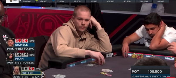 Nel ME WSOP 2024 ha chiuso 647°, anche per merito di questa giocata. I bui sono 1k/1,5k/1,5k – siamo quindi ancora molto lontani dalla zona itm – e Robert Eichele (stack 83.500) apre da mid position a 3.500 con Q♥Q♦. Risponde Lynn Phan (263k) da cutoff limitandosi a chiamare con in mano A♠A♣. Altra trappola come quella di Kristen Bicknell Foxen? Probabilmente sì, e potenzialmente killer non solo per Eichele ma anche per Barry Hunter (220k) che da Bottone spilla K♠K♦ e tribetta 12.000.