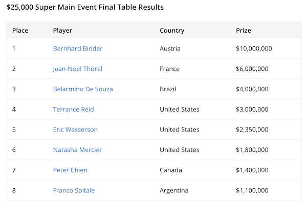 Adesso il ruolo di “new king on the block” spetta a un giocatore austriaco che, prima di questa enorme vittoria, vantava 22 piazzamenti a premio dal 2018, per un totale di circa 82.000 dollari. Ieri, Bernhard Binder ha più che decuplicato quella cifra. Ha vinto l’evento con il montepremi più alto mai assegnato in un torneo di poker garantito, grazie a 2.891 iscrizioni da $25k: $72.275.000, con $10.000.000 riservati al vincitore!