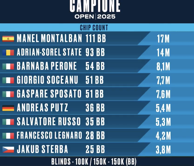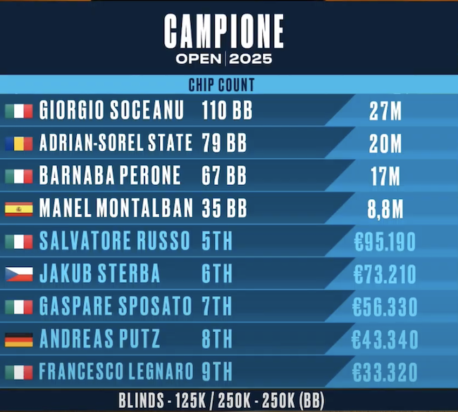 All’inizio del livello 35, Giorgio Soceanu forbetta all-in con AJoff sulla tribet di Manel che ha invece coppia di 10: l’azione è efficace, perché lo spagnolo folda. Poco dopo Russo apre con K♠K♥, Legnaro spilla 10♦10♣ e va all-in. Call facile per Russo che domina l’avversario sul board e lo elimina dal final table, per un payout di €33.320.