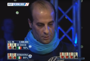 Qualche minuto dopo arriva il primo player out. E’ Antonino Venneri, l’ultimo giocatore italiano rimasto in gara. Il veterano apre a 1 milione da early con 10♣10♠ e poi chiama la tribet da 2,6 milioni di Wyrzykiewicz. Al flop 8♦5♠3♠ Venneri va in check raise all-in ma si trova l’instant call del polacco, nuovamente premiato dagli Assi. Il board è liscio e Venneri lascia il torneo al nono posto per 45.400 euro di premio.