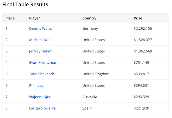 Degno di nota è il 4° posto di Joao Vieira, perché segue a breve distanza di tempo la vittoria nell‘evento #38: $100.000 High Roller.