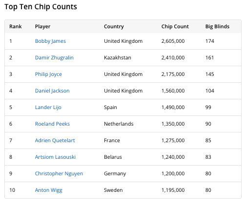 Il britannico ha chiuso il Day3 con 2.605.000 chips, precedendo il kazako Damir Zhugralin (2.410.000). Il “dominion” britannico è tale, almeno per ora, grazie al 3° posto di Philip Joyce e al 4° Daniel Jackson. Questa è la top 10: