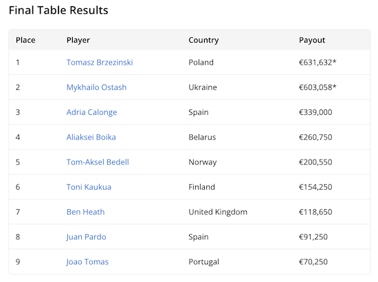 Il sogno, però, si è infranto poco dopo. Brzezinski ha avuto la meglio con A-J contro A-10, lasciando Mykhailo Ostash con un solo big blind. Al 12° all-in dell’ucraino, il 14° dell’heads-up, il polacco ha chiuso i conti. All-in dell’ucraino con 5♥4♠ e call del polacco che gira 10♣4♦. L’ultimo board mostra Q♦J♠10♦4♣6♥, doppia coppia per Tomasz Brzezinski che vince una delle finali più combattute e imprevedibili degli ultimi anni.