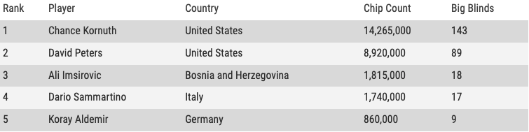 Dario Sammartino ci arriva con il 4° stack, dietro a Kornuth (1°), Peters (2°) e Aldemir (3°). Il primo out del FT è Daniel Negreanu scoppiato da Chance Kornuth: AK per KidPoker vs AQ e Q♥ al river.