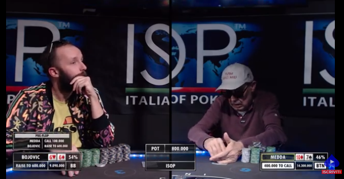Il player slavo, riesce però a ribaltare la situazione dopo circa un’ora di sfida, quando bluff-catcha Medda su questo board: 5♠4♥Q♦8♠3♥. L’italiano punta 1,8 milioni su un pot di 6,5 con 9♥6♠ in mano. Bojovic snappa, mostra Q♠7♠ e sorpassa l’avversario 14,5 mil. a 9,6 (circa).