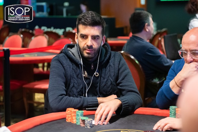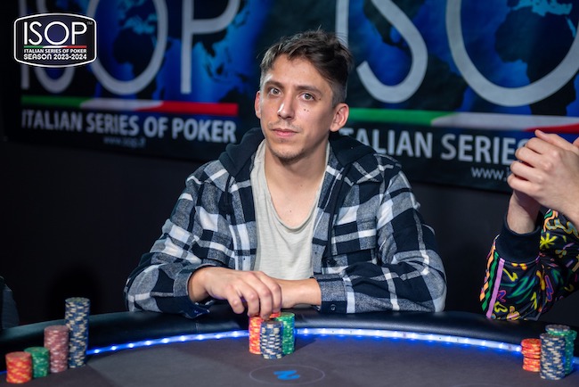Quello più affollato raduna almeno 4 giocatori di livello (Levato, Bencich, Forti e Bojovic), ma il primo player out arriva dal tavolo 7-handed. Elvis Kallashi (3° nel ME ISOP 2024 Stage 3) va all-in diretto per 420k con A♠9♠ da mid position e trova il call di Luca Zanesi che ha Q♥Q♣. Il board scorre liscio ed elimina Kallashi 15°.