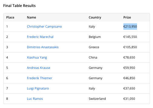 Christopher Campisano aveva finora realizzato 29 itm, per un totale di 76.500 dollari, ma la vittoria alle WSOPE 2024 vale da sola €213.950.