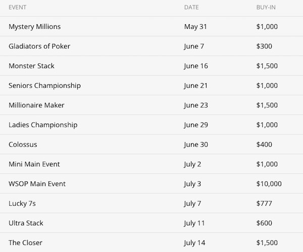 Tra gli eventi più famosi e già confermati ci sono anche il Ladies e il Seniors, il Millionaire Maker, il Gladiators (il torneo con il buy-in più basso, $300) e ovviamente il Main Event. Il campionato del mondo di Texas Hold’em inizia il 3 luglio e comprende 4 flights, cioè 4 Day1, fino 6 luglio. I giocatori potranno ancora registrarsi il 7 e l’8, in occasione del Day2ab e del Day2cd.