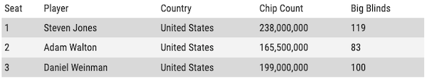 La cosa risulta ancora più estrema se si considera che all’inizio del Day 10 nessuno dei tre era particolare a corto di chips. Perfino lo shortstack del trio, Adam Walton, partiva con 83 bb, una dotazione sufficiente per non avere troppa fretta di mettere tutte le chips in mezzo.