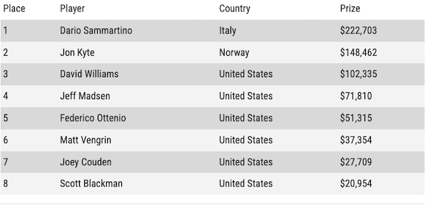 Incassato il monster pot, Sammartino non ha praticamente più concesso chips al suo avversario. Ha crushato con colore la scala Broadway di Kyte di nuovo in una fase di Omaha, e ha poi chiuso il conto nel round di Stud Hi-Lo.